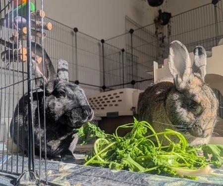 Both rabbits know the sound of the treat bag and come running when they hear it. They enjoy eating together and spending time side by side. They are very good with their litter habits.