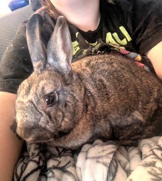 Radish is the brown rabbit. She is calmer and more reserved, but very sweet. Once she’s comfortable, she enjoys being close and quietly sharing space with her people.